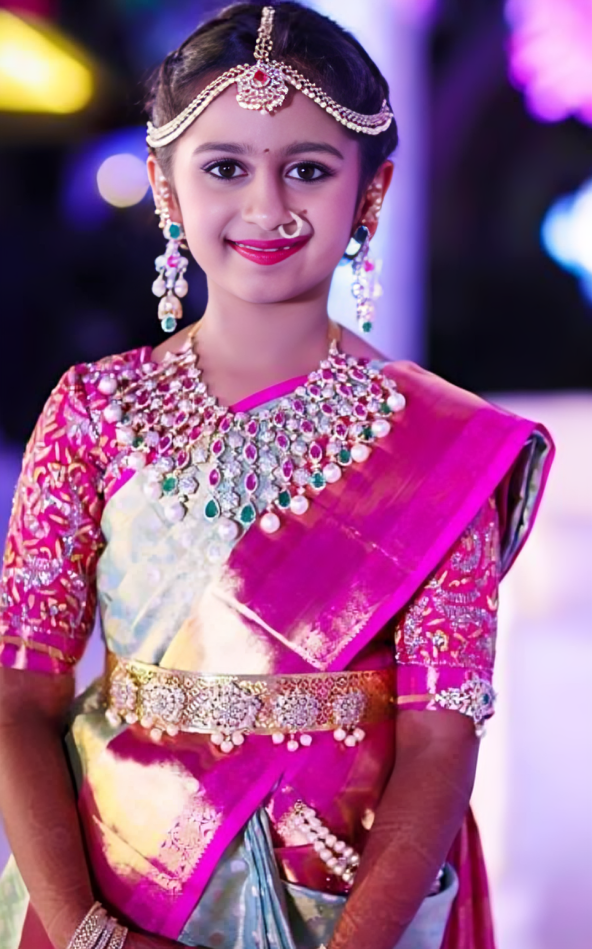 The Half Saree function, also known as the Voni Function or Langa Voni โ€‹Function, is a significant cultural event celebrated in South India, โ€‹particularly in states like Andhra Pradesh, Telangana, and Tamil Nadu. โ€‹ A half saree, or langa voni, is worn by young girls to symbolize their transition from childhood to adolescence during this ceremony. For the following reasons, a special entry for the girl participating in the Half Saree function is very important: